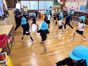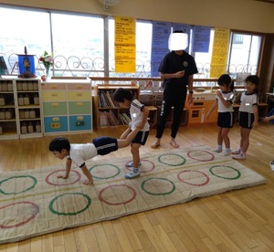 準備運動や手押し車を2人組で協力してマット運動をしました。