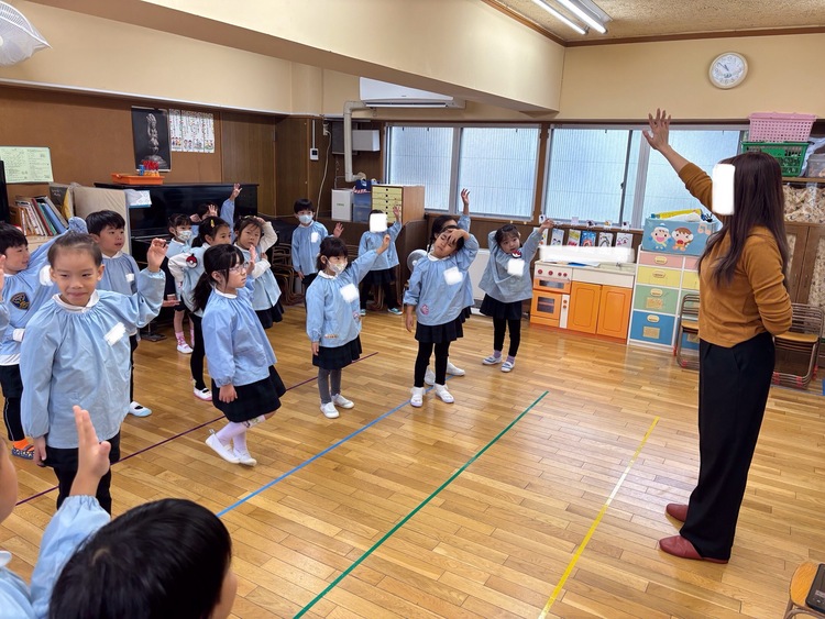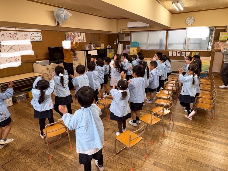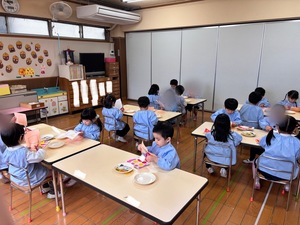 英語を楽しんだ後、壁面製作で「きのこ」を作りました。