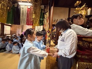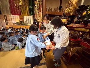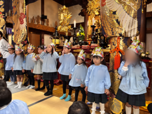 お地蔵さまに対する無心な気持ちを尊重し、園児たちの成長と家内安全を願うご両親の思いを大切に地蔵札にお願い事を書いて礼拝を行いました。